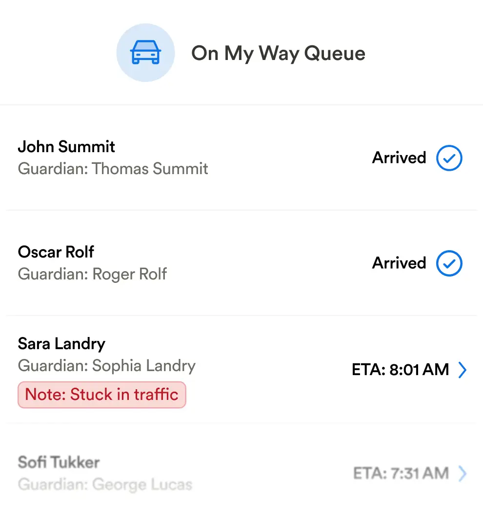 With the On My Way queue, families can share their ETA. Your staff gets a heads-up so transitions are calm, not chaotic.
