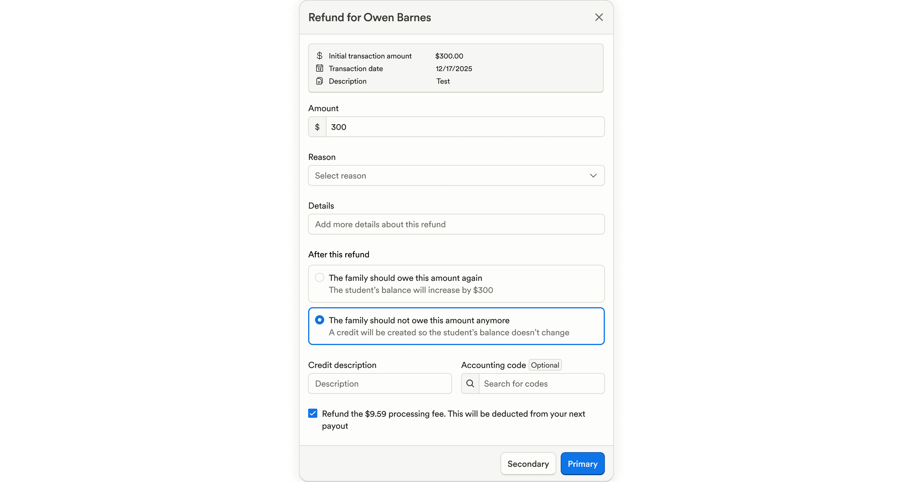 When issuing a refund, admins can now choose whether the family should owe the amount again or have the balance cleared, giving more control over billing outcomes and eliminating any manual action that needs to be taken.