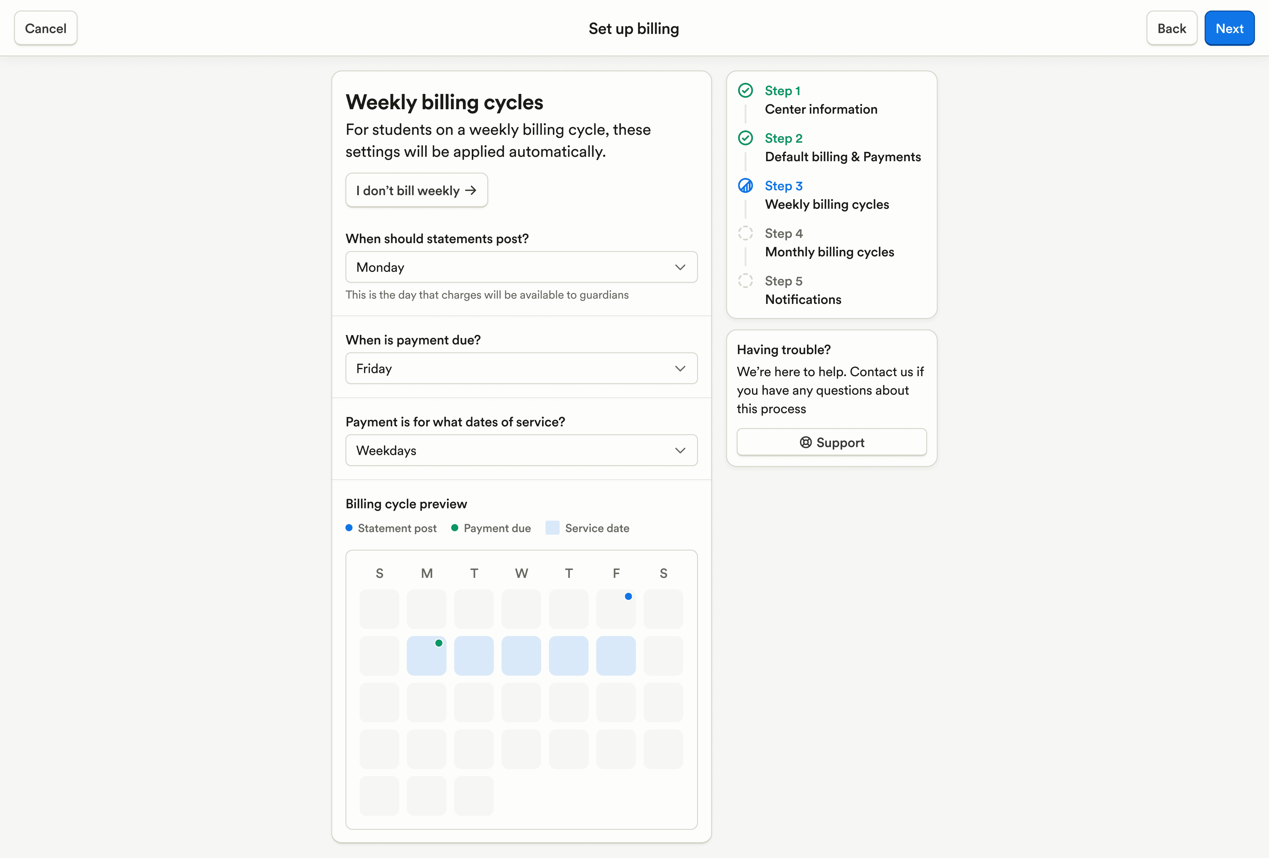 Billing setup has been fully redesigned with a new wizard that replaces the original setup flow, including a full billing cycle preview to clearly explain service dates, post dates, and due dates. This should make it much easier for new providers to configure their billing settings on their own!
