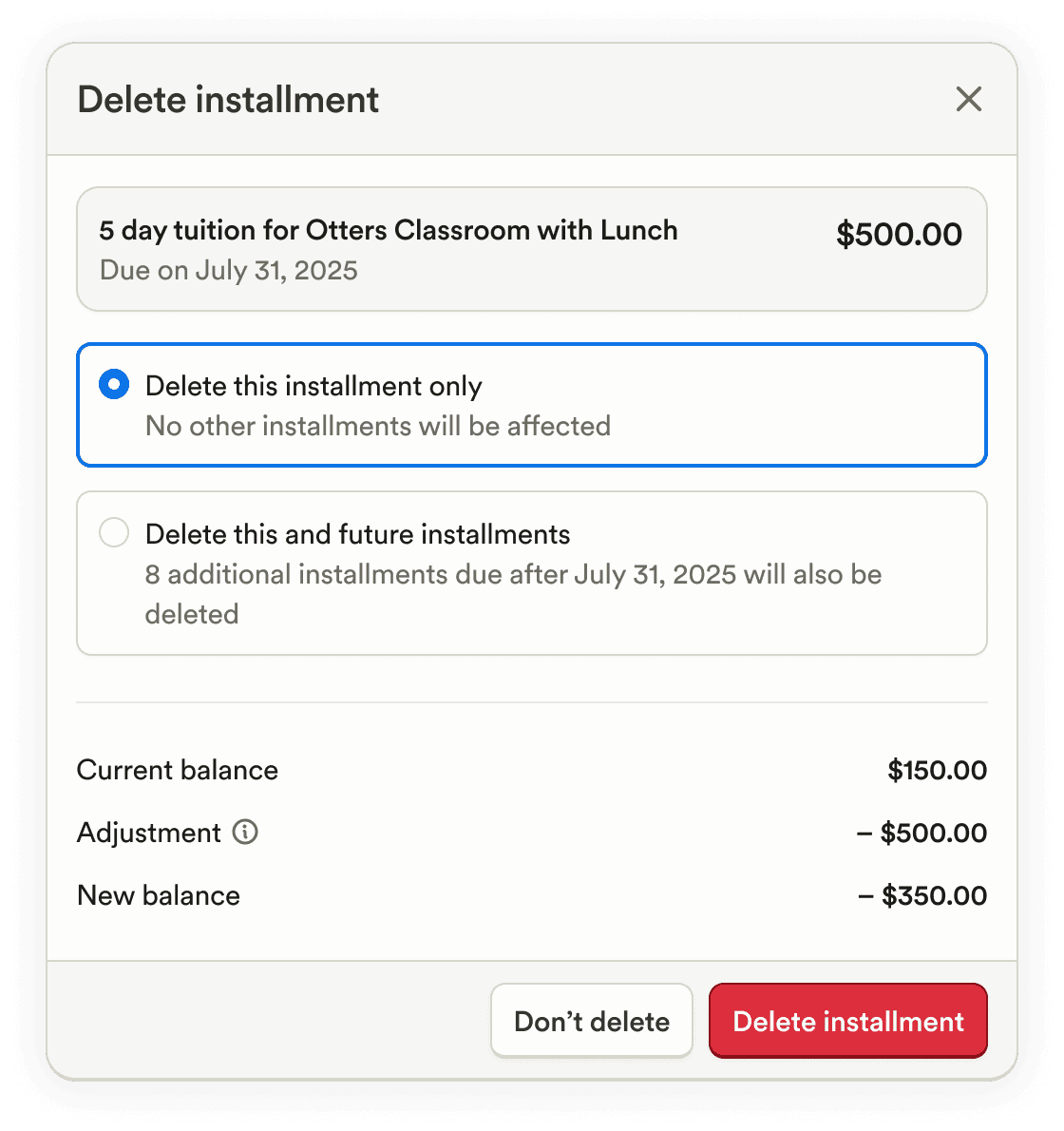 When deleting charges or payments, the impact on a student’s balance is now clearly shown, including the adjustment amount, the new balance, and a confirmation step before applying the change.