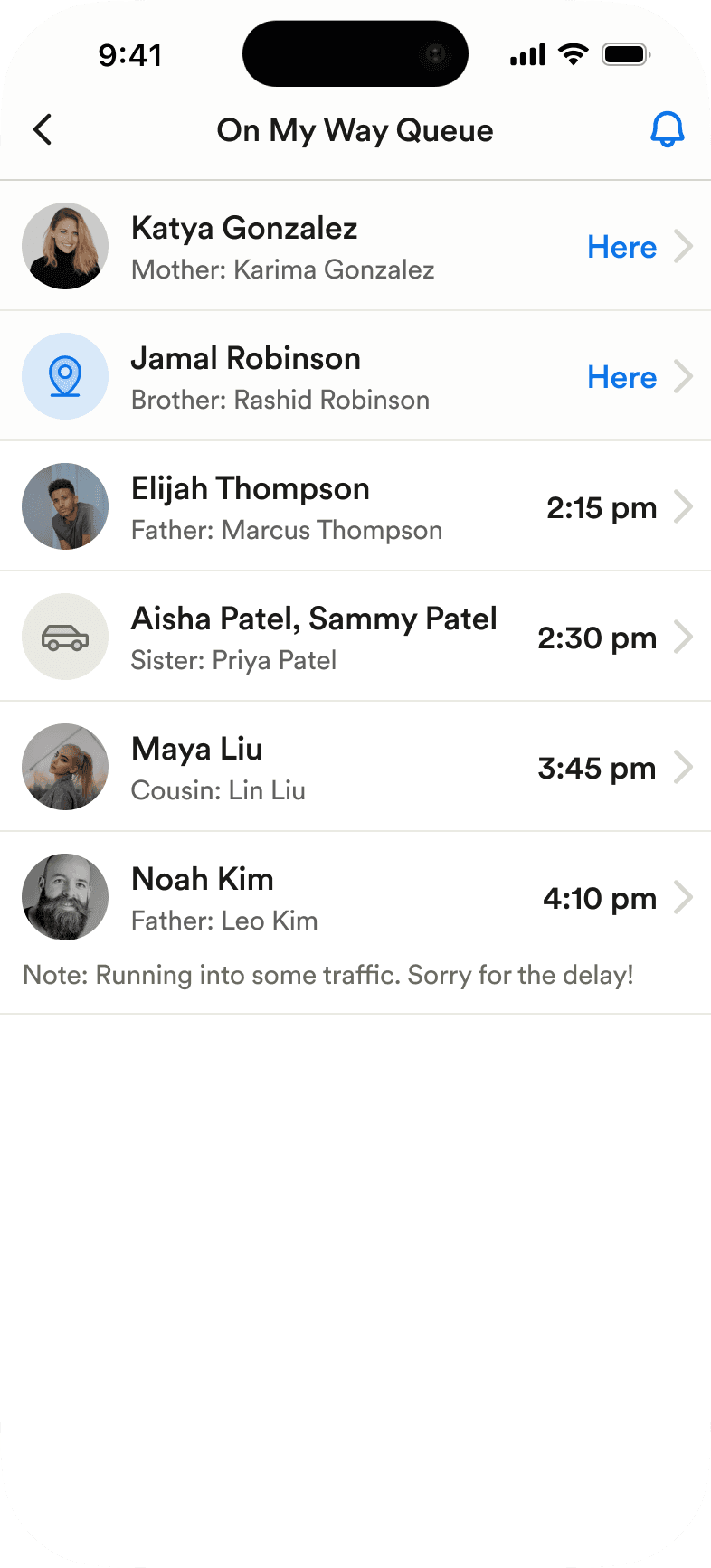 In the On My Way queue, guardian photos and relationships are now shown, with a simplified ETA display to make pickup status easier to understand at a glance.