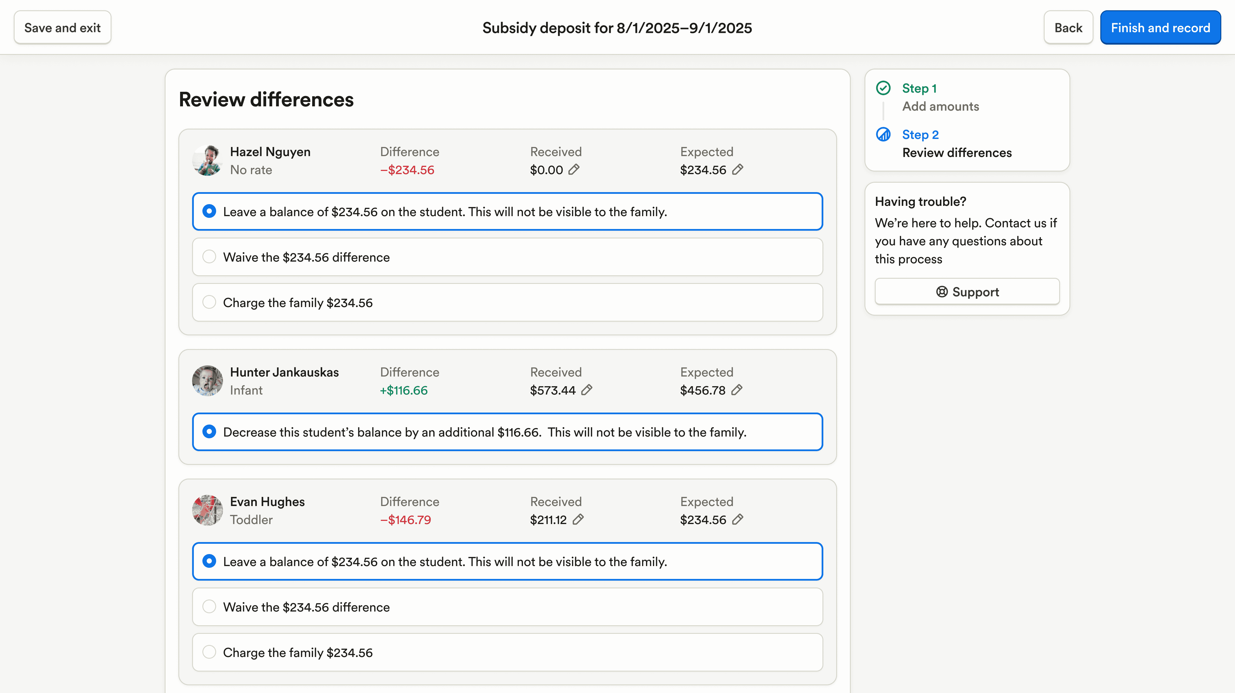 The subsidy record deposit flow has been refreshed with clearer totals and more context when taking actions, improving accuracy during reconciliation.