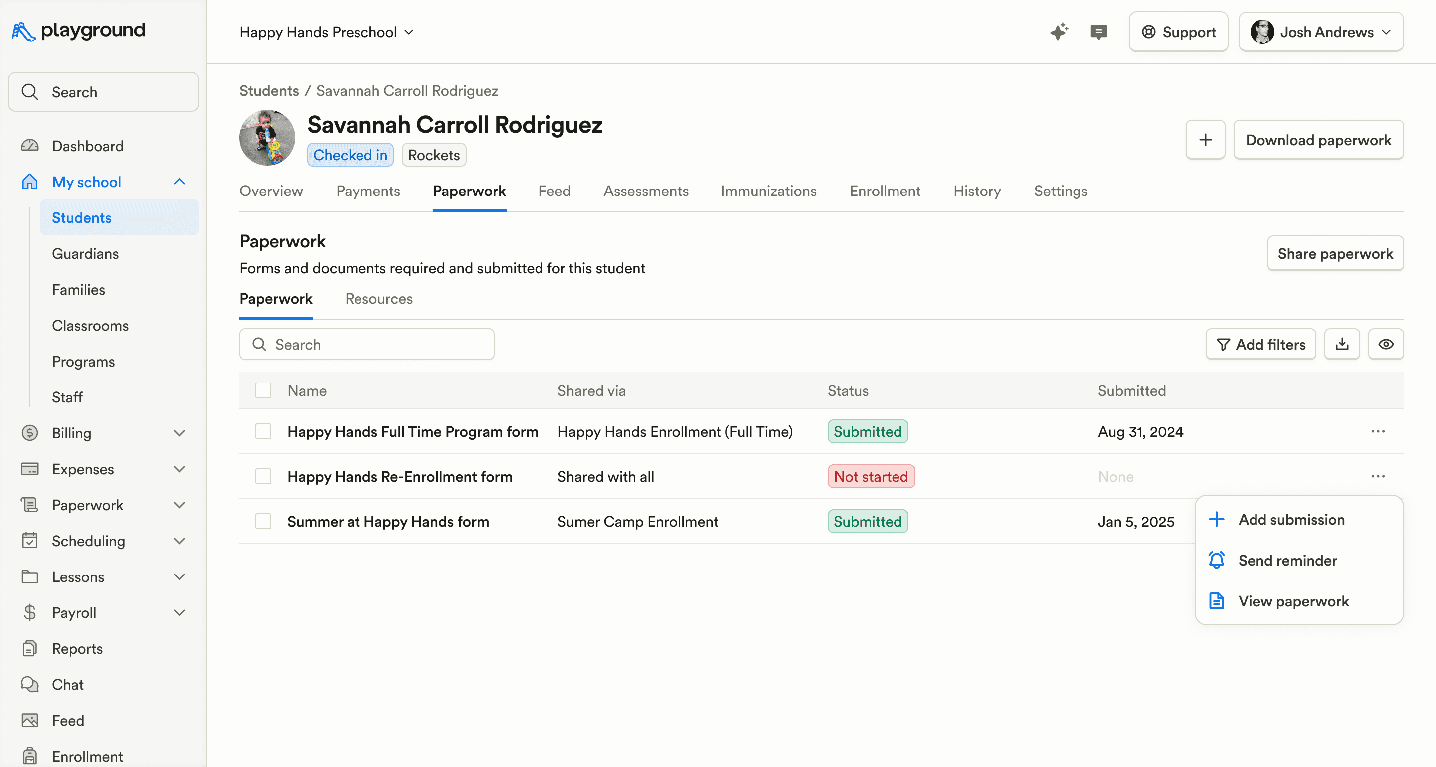 Admins can now send paperwork reminders directly from individual student profiles, in addition to the main Paperwork tab, speeding up follow-ups.