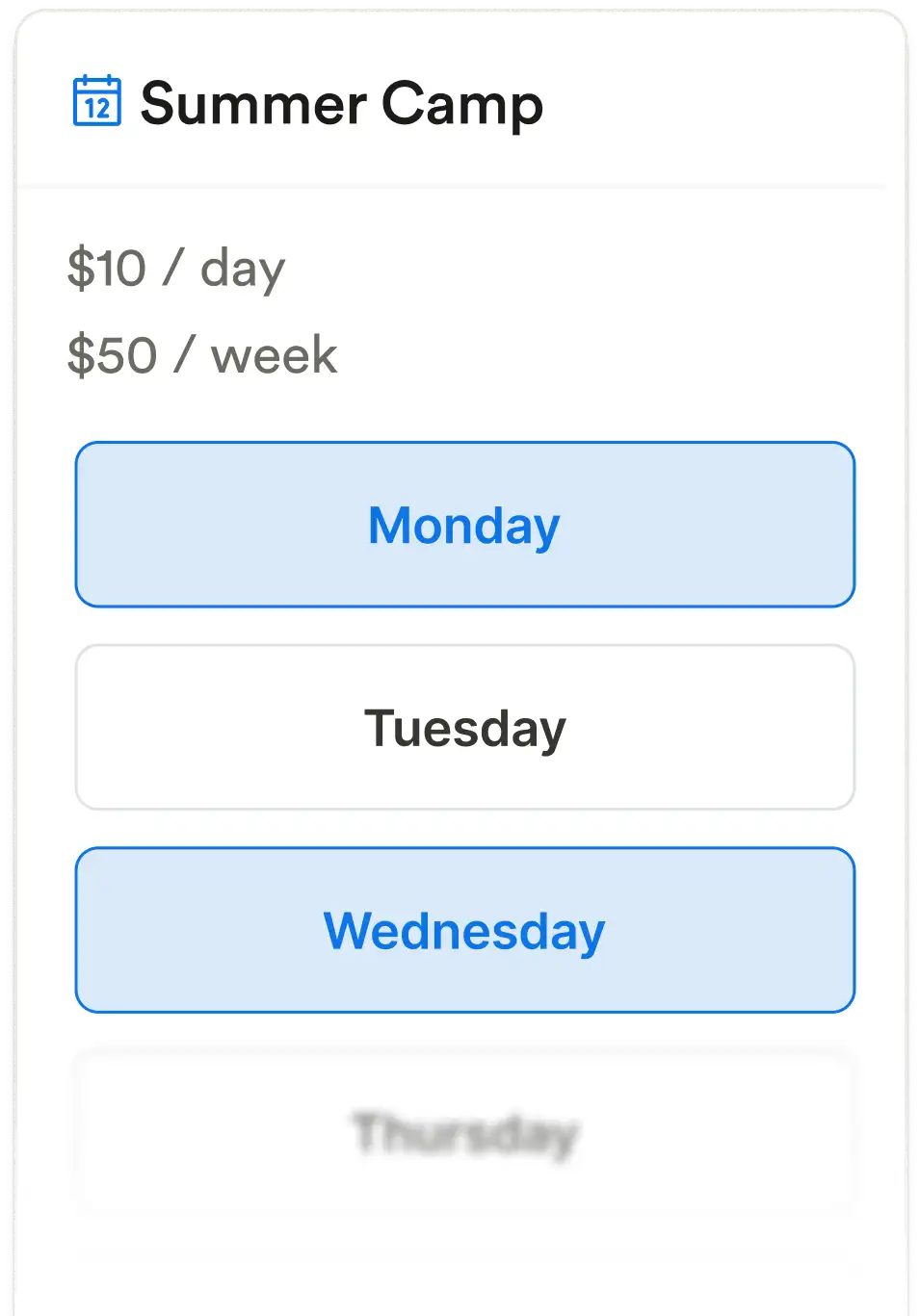 Families can register in minutes, selecting only the dates or sessions they need, while your team stays in control. Playground gives you multiple ways to structure enrollment.
