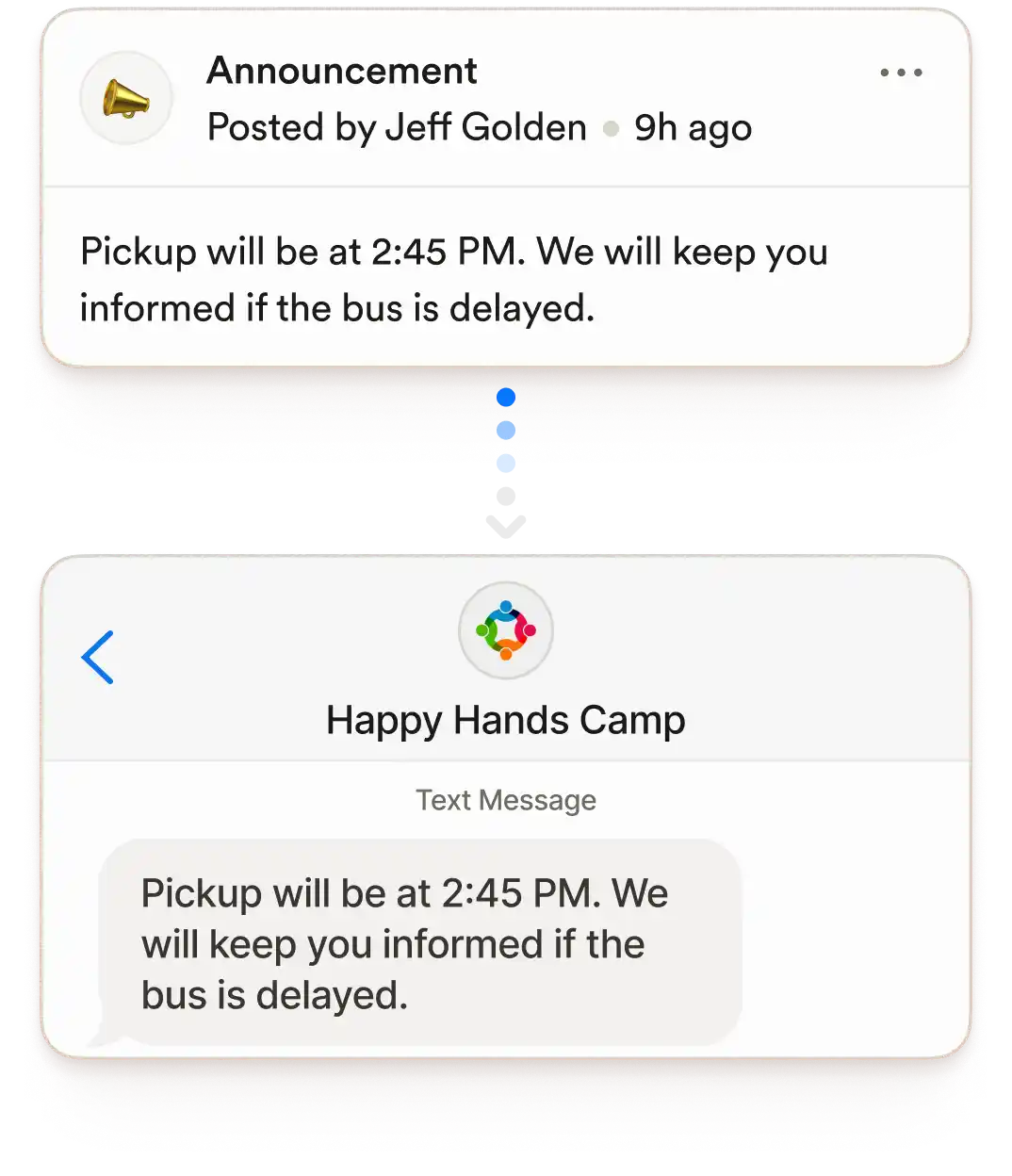 No more phone calls about “what group is my kid in again?” Everything is in the app. Keep families informed before, during, and after each camp day: