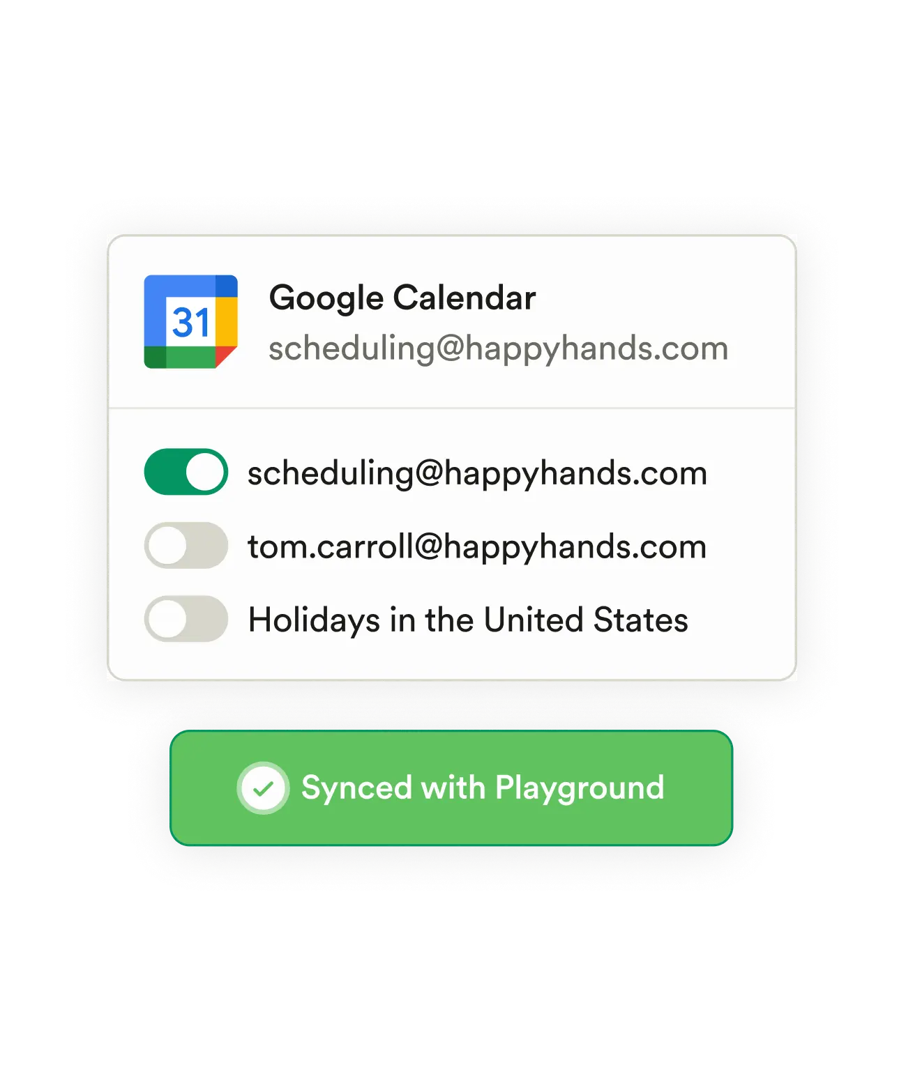 Bring Google Calendar into Playground so scheduling stays accurate automatically. Meetings are added instantly, availability stays up to date, and conflicts are filtered out before anyone books.