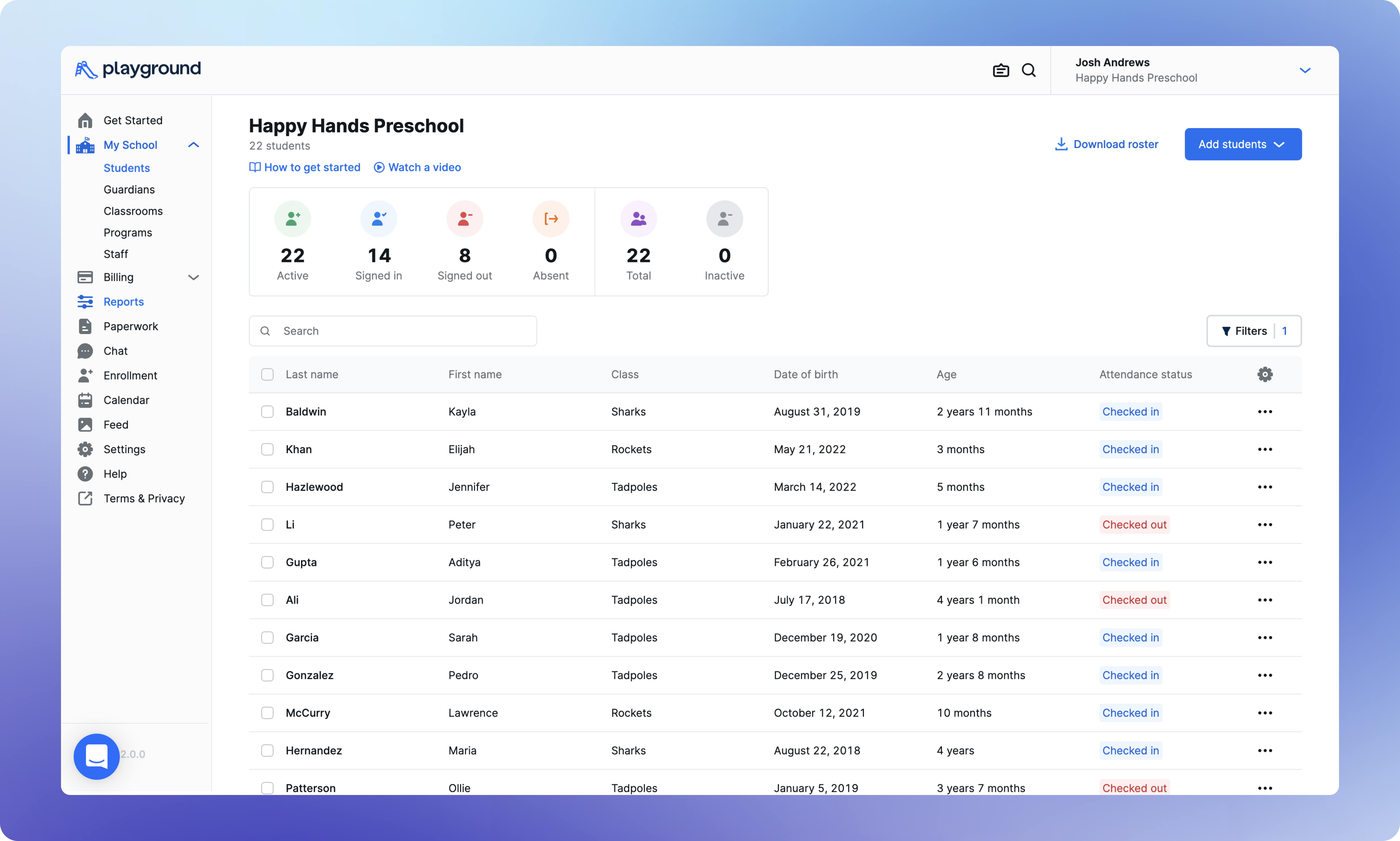 Playground has every feature you need to effortlessly run an early child care center, a daycare center, or a preschool from child management to HR. Replace a wide variety of daycare management software modules such as: