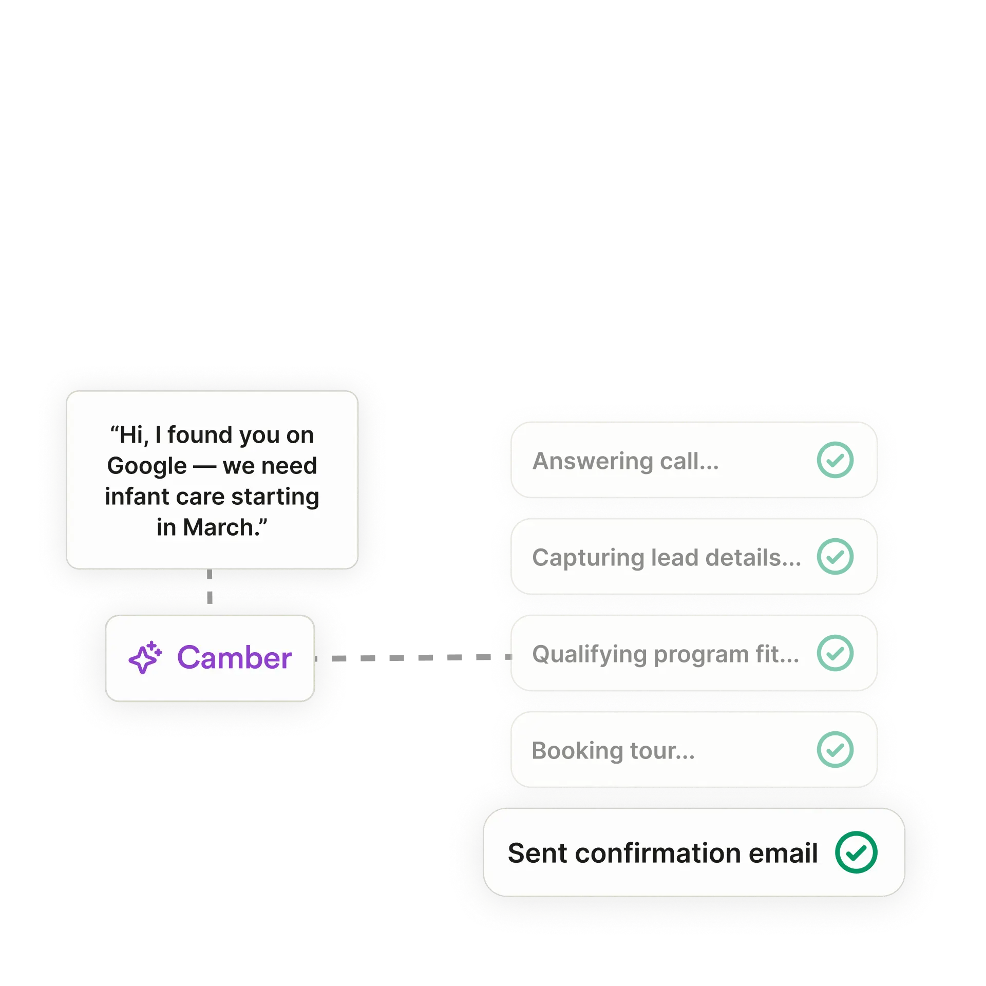 Camber is an AI employee for child care that answers inquiry calls, supports your staff, and handles the daily admin work delivering more capacity for a fraction of the cost of an additional hire.